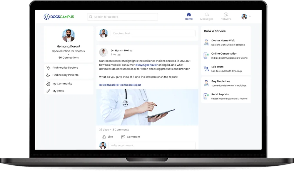 DocsCampus.com claims to be the first online healthcare network in India. The website allows doctors to build their professional network to share and access knowledge and find school alumni, mentors and peers. It provides a safe, private space for them to share information and oaths.